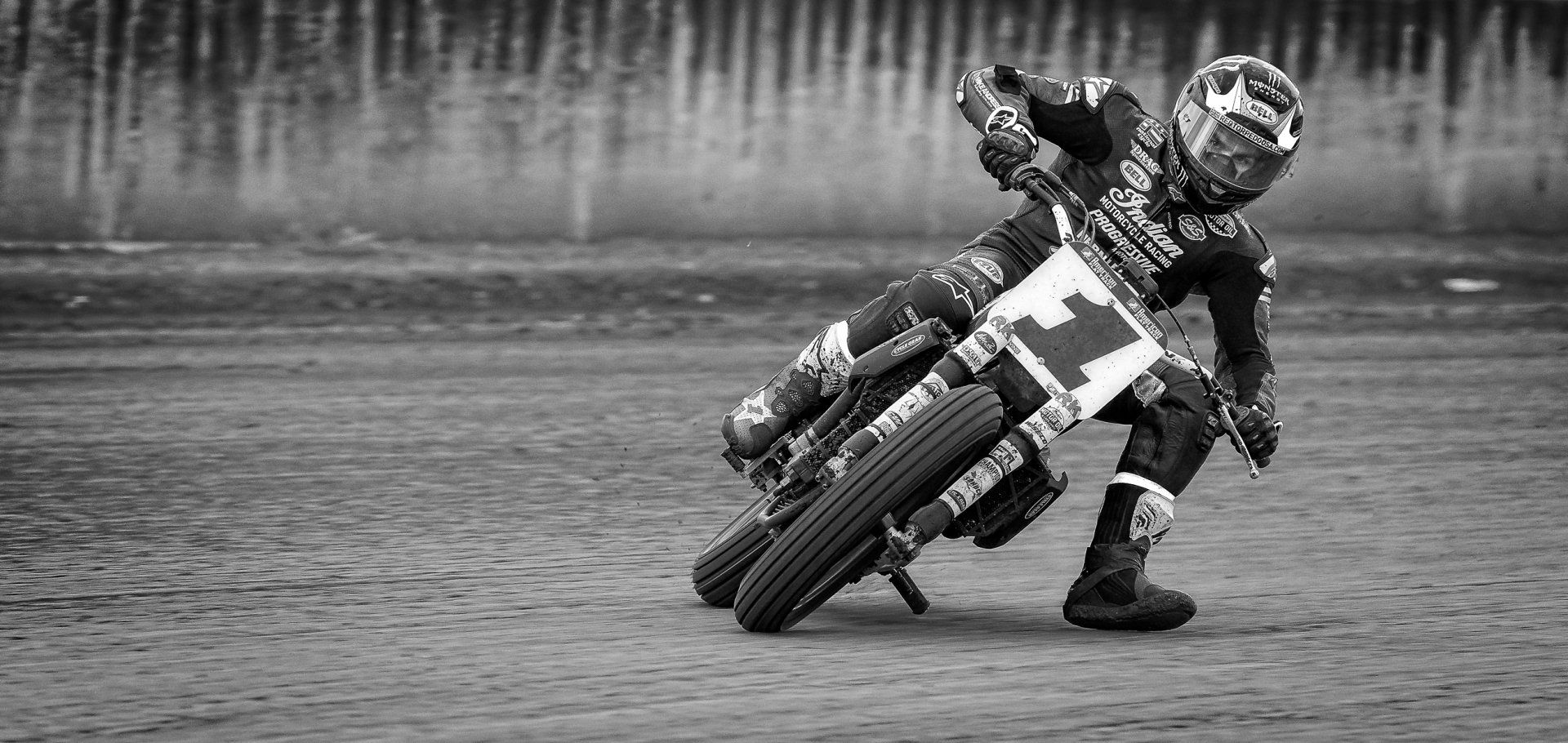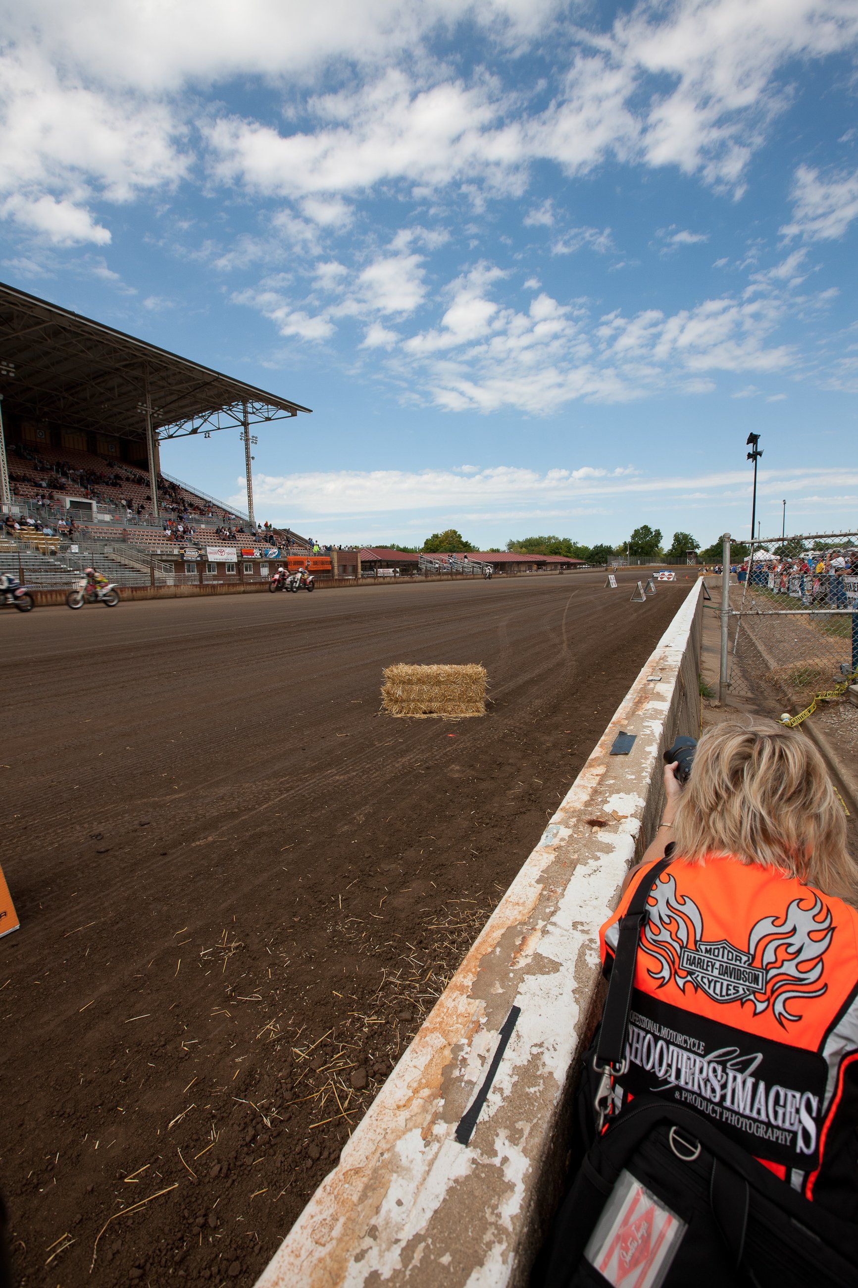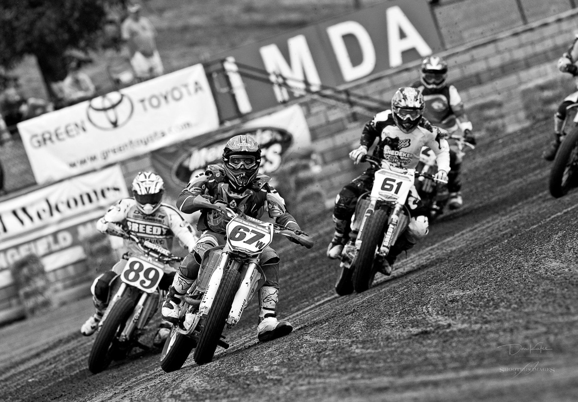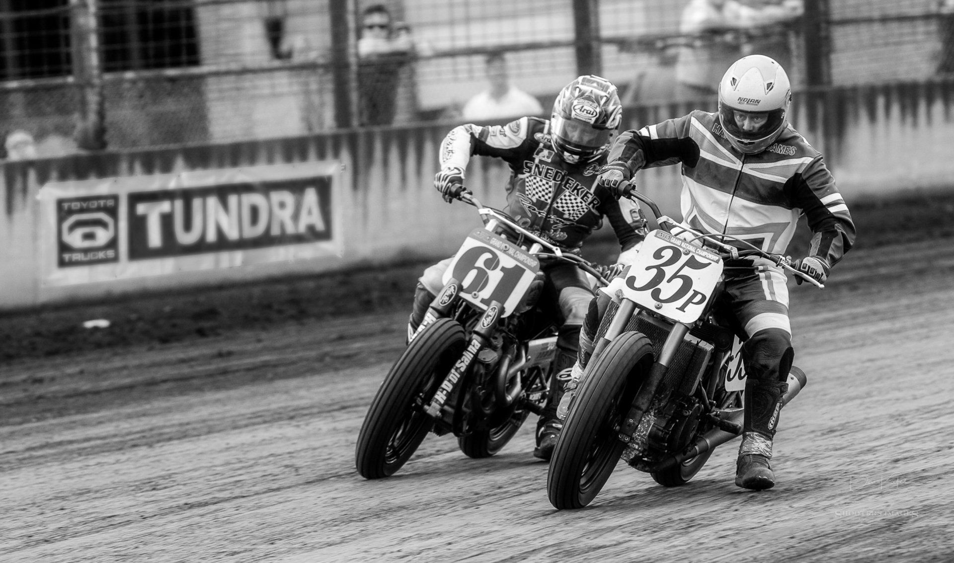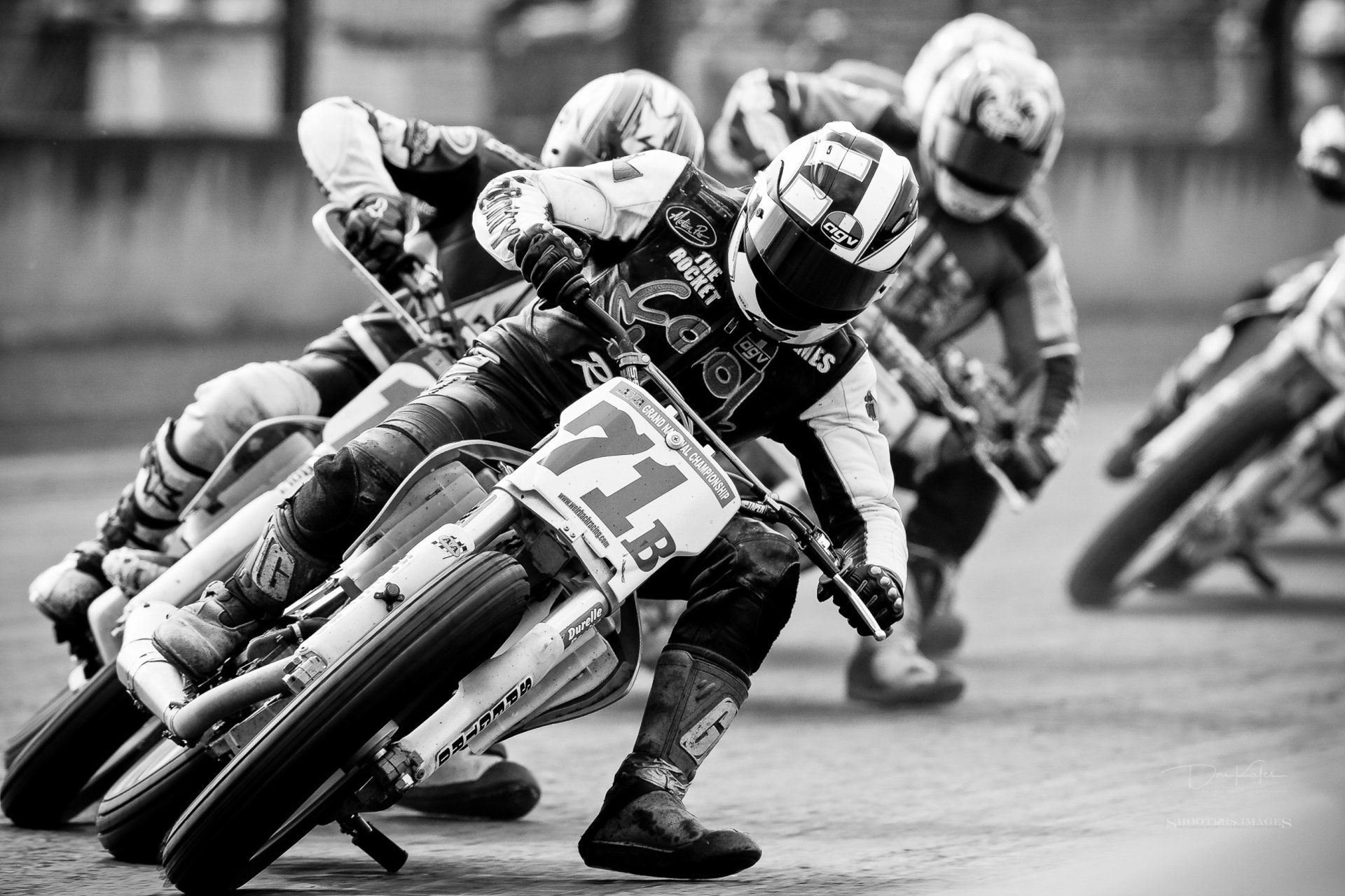 Most of my experience shooting races has been with flat track racing, but I occasionally shoot motocross, drag races, and snowmobiles. Much like rodeo photography, I'm kind of an "outsider" in that I don't follow a circuit and post images for sale to participants. I shot the Springfield Mile twice a year for over 7 years for Toyota. I originally shot the Mile for an article for Harley-Davidson's HOG Magazine. So, my focus has always been to document the event rather than get individual shots that I could sell. This allowed me to experiment a bit with different angles, shooting techniques, less popular track positions, and so on. Among a sea of conventional 70-200mm lenses, I mostly shot with 400mm and 600mm lenses which gave an entirely different look than the "accepted" lenses. I also shot with extreme wide angle lenses, which produced some of my favorite images. Shooting riders at 100+mph which such long lenses also proved to be an enjoyable challenge.